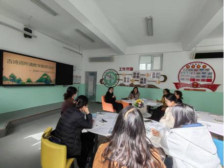 理论筑基,发挥示范引领。为强化教师理论素养,工作室提出“学研结合”机制。一是通过聚力教研,实现理论共进。每次教研活动学习两章理论内容,结合交流与撰写心得,择优推送至教育局吟诵专栏。二是通过实操示范,实现方法领航。通过幻灯片演示吟诵规则,如“依字行腔”“依义行调”,并现场示范教学方法。三是通过打卡督学,实现笃行致远。每周完成一首诗的吟诵打卡,纳入评优评先考核体系。